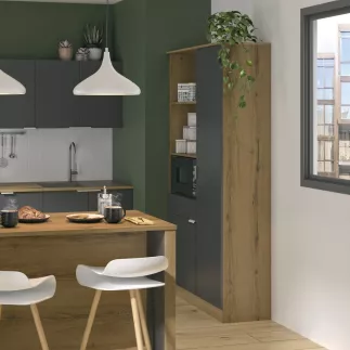 Corps du meuble en décor imitation chêne. Les façades sont en mélamine anthracite finition mat.