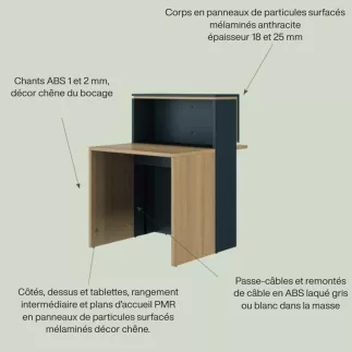 Accessoires: 1 tablette repose-sac,2 passe-câbles,2 remontées de câbles. Eclairage LED intégré, côté visiteur. Tablette support écran amovible largeur 60 cm profondeur 22 cm ouvrant sur une niche réglable 3 positions : 42, 45 et 48 cm de hauteur.