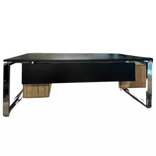 Couleur: Plateau noir/Pieds chromés/Meuble de retour et caisson sous bureau Timber