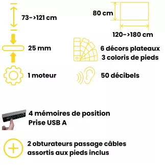 Équipé d’un système électrique à 1 moteur, ce bureau assure une montée fluide et silencieuse. Son boîtier de commande avec 4 mémoires de position permet d’enregistrer les hauteurs préférées pour un réglage rapide et intuitif au quotidien. Le port USB-A intégré apporte une fonctionnalité supplémentaire très appréciée pour la recharge des appareils mobiles directement depuis le poste de travail.