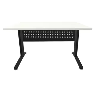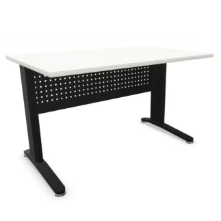 Matière: Plateau mélaminé / Piètement métallique à dégagement latéral / Voile de fond métallique avec passe-câbles
