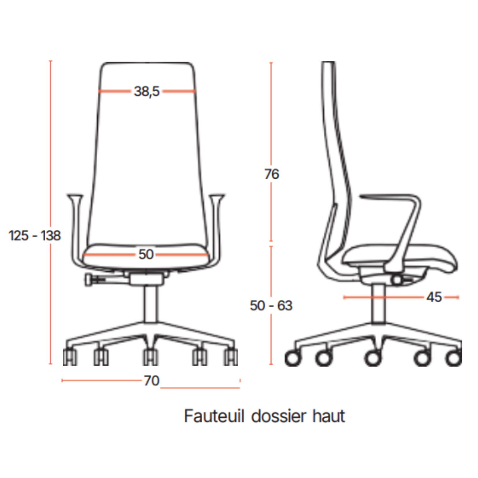 Hauteur: Réglable par vérin à gaz de 50 à 63 cm/hauteur totale de 125 à 138cm
