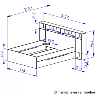 Tête de lit cosy haute avec des rangements ouverts et des tablettes chevets escamotables.
