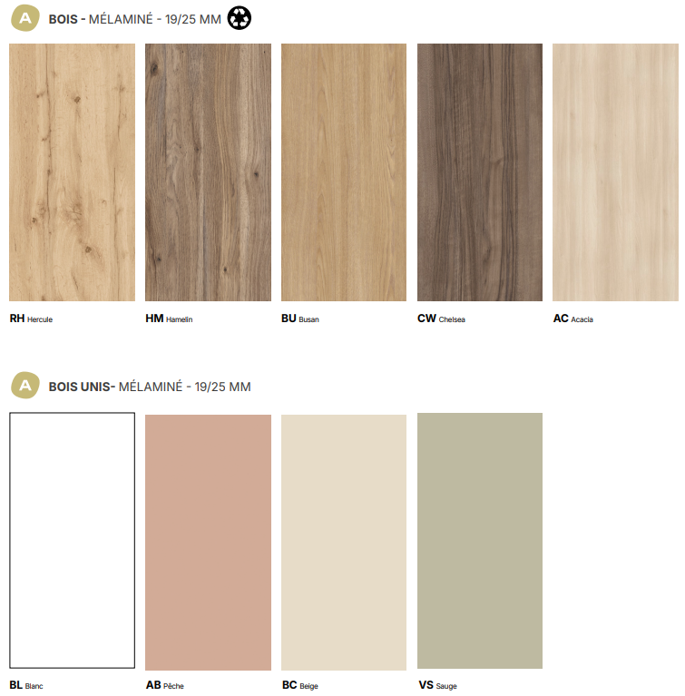 Bac: Panneau de particules épaisseur 19 mm, revêtu (double face) d'un imprimé mélaminé (recyclé 85 %). PEFC 100 %