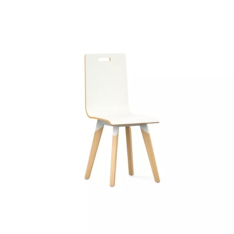 "Les chaises Evasion sont robustes avec une assise confortable, un entretien facile et une poignée intégrée au dossier pour une meilleure prise en main, le subtil mélange des matières leur donne un aspect élancé"
