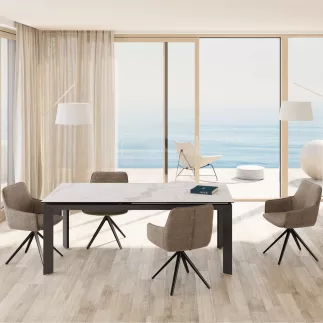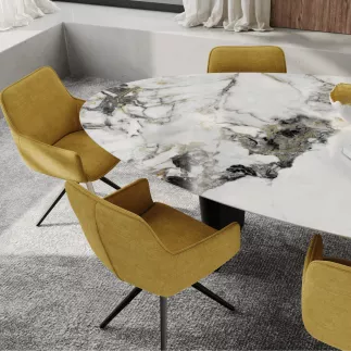Surprenez vos convives avec la chaise Amsterdam : confort, esthétisme et ergonomie sont au rendez-vous. Haute de 84 cm, cette chaise avec assise pivotante est dotée d’un piètement en acier laqué noir mat, fin et raffiné, qui met en valeur la couleur du tissu. Amsterdam sera l’alliée d’une salle à manger à la décoration réussie.