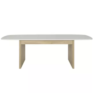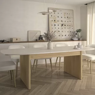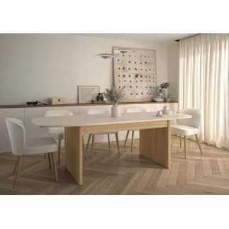 Grande table à repas extensible, passant de 200 à 248 cm grâce à son allonge escamotable qui se déplie et se range facilement sous le plateau avec un système papillon. Les plateaux et l’allonge de 48 cm en mélamine aspect minéral offrent robustesse et résistance au quotidien. Son plateau arrondi, de 100 cm de profondeur au centre, assure confort et espace pour les convives, pouvant accueillir de 6 à 10 personnes.