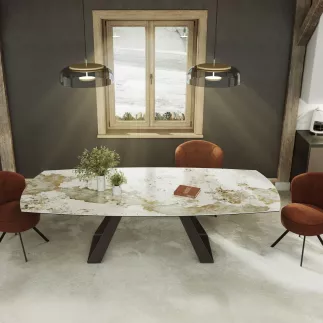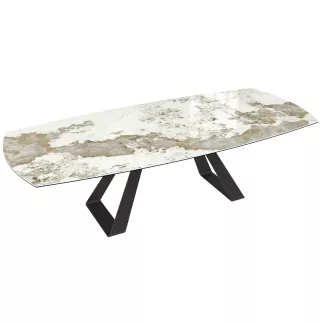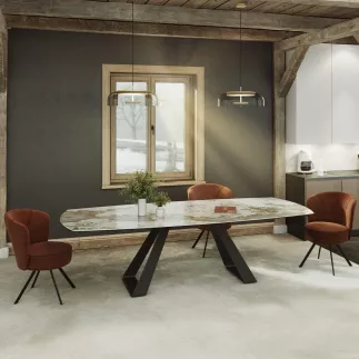 Michigan, une nouvelle table de repas extensible. Pratique, elle est dotée de deux rallonges latérales de 40 cm. Ce modèle vous permet de passer d’une surface de plateau de 1,90 x 1,20 m à une surface de 2,70 x 1,20 m. Accueillez 6 à 8 personnes lorsque les rallonges sont fermées et 10 à 12 personnes lorsque les rallonges sont ouvertes. Son plateau est conçu en céramique de 6 mm collée sur un verre de 8 mm. Son piétement évasé en forme de triangle, est conçu en acier laqué noir mat, il assure une excellente stabilité.