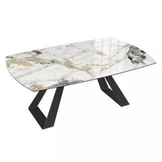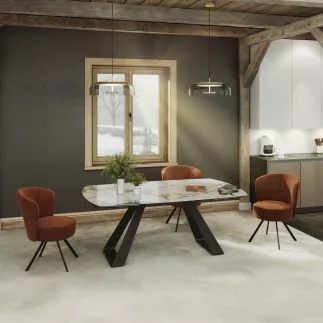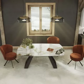Michigan, une nouvelle table de repas extensible. Pratique, elle est dotée de deux rallonges latérales de 40 cm. Ce modèle vous permet de passer d’une surface de plateau de 1,90 x 1,20 m à une surface de 2,70 x 1,20 m. Accueillez 6 à 8 personnes lorsque les rallonges sont fermées et 10 à 12 personnes lorsque les rallonges sont ouvertes. Son plateau est conçu en céramique de 6 mm collée sur un verre de 8 mm. Son piétement évasé en forme de triangle, est conçu en acier laqué noir mat, il assure une excellente stabilité.