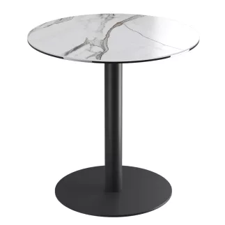 Orlando est une table de 75 cm de hauteur avec un plateau en céramique de 3 mm collé sur un verre de 8 mm. Son diamètre est de 75 cm. Son piétement est en acier laqué noir mat.