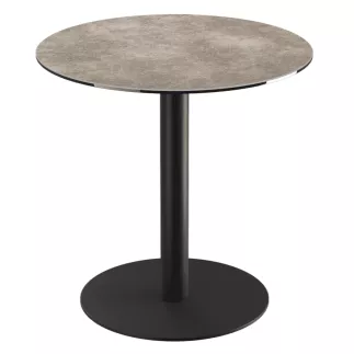 Orlando est une table de 75 cm de hauteur avec un plateau en céramique de 3 mm collé sur un verre de 8 mm. Son diamètre est de 75 cm. Son piétement est en acier laqué noir mat.