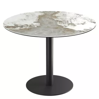Orlando est la table ronde simple et tendance de 75 cm de hauteur avec un plateau en céramique de 3 mm d’épaisseur collé sur un verre de 8 mm. Son diamètre est de 100 cm. Son piétement en acier laqué noir mat s’alliera parfaitement d’en une décoration tendance, chic industrielle.