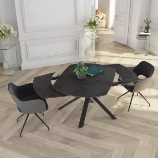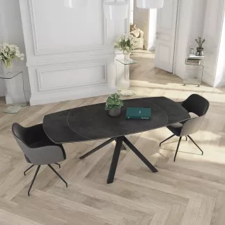 Informations: Fermée, elle mesure 130 cm, idéale pour les petits espaces, la cuisine ou encore en appartement. Vous pouvez l'agrandir jusqu'à 190 cm et déployer ses deux rallonges à chaque extrémité en faisant simplement pivoter son plateau central. Son piétement original en acier laqué noir mat est parfait pour apporter une touche design et moderne dans votre intérieur. Sa céramique, en provenance d'Espagne, mesure 3 mm d'épaisseur et est collée sur un verre de 8 mm pour garantir une table stable, facile d'entretien et réellement solide.