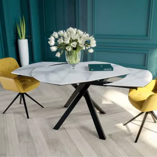 Informations: Fermée, elle mesure 130 cm, idéale pour les petits espaces, la cuisine ou encore en appartement. Vous pouvez l'agrandir jusqu'à 190 cm et déployer ses deux rallonges à chaque extrémité en faisant simplement pivoter son plateau central. Son piétement original en acier laqué noir mat est parfait pour apporter une touche design et moderne dans votre intérieur. Sa céramique, en provenance d'Espagne, mesure 3 mm d'épaisseur et est collée sur un verre de 8 mm pour garantir une table stable, facile d'entretien et réellement solide.